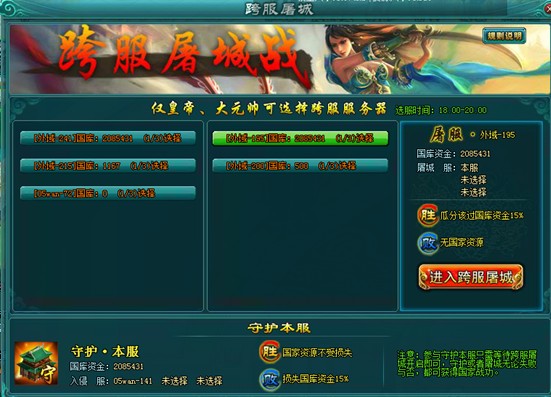 当前服务器被两个服务器屠城成功时,奖励/扣除瓜分当前国家资金的18%;